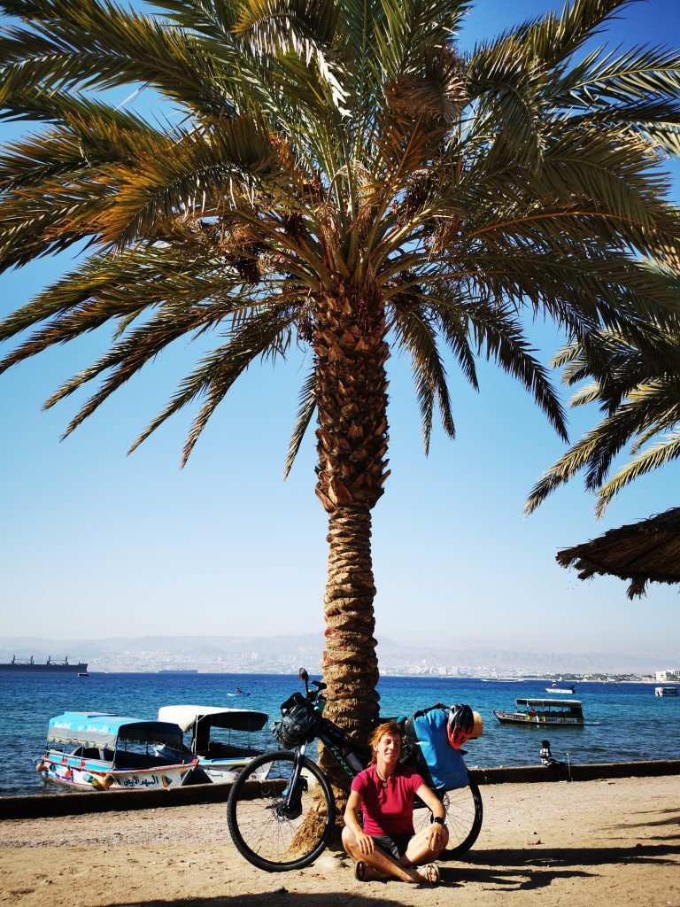 Ostatnim punktem naszej wycieczki rowerowej była Akaba. Turystyczne miejsce, gdzie jednak można znaleźć bardzo tanie falafle i darmowy camping na publicznej „Soutch beach”, czy jak mówią tablice po drodze”public beach number 4″, a która jak sama nazwa wskazuje leży na południe od Akaby. Można rozbić się na samej plaży, ale także na uboczy przy sklepiku gdzie w namiocie od 5 lat mieszka chłopak, który na pewno z chęcią pozwoli Wam rozbić swój namiot obok swojego. Na plaży jest bezpłatny prysznic i toaleta. Czego od życia chcieć więcej? 🙂